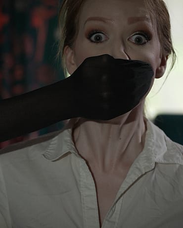 Sexy secretary Sonia is taken by a lunatic woman who thinks that she is the host of a nylon encasement game show in which she encases her guest "assistants" in hosiery and fucks them.