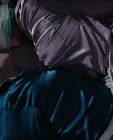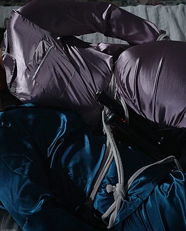 Long time lovers Vonka and Syenite have a very special relationship with their friend Tina. They love to be dominated and bound as a couple and Tina loves to do it for them! They set up play dates and make a whole night filled with rope, tape, hitachis and fat dildos. Tina loves to take her time and watch them struggle. This evening they explored the smooth feeling of satin pajamas under the bondage and it was so erotic. The silk fabric made everything so much more sensual!