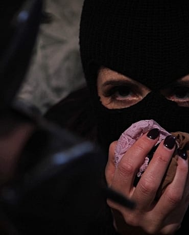 A female cat burglar happens to interrupt Riley's pantyhose foot fetish webcam show. Lucky for the cat burglar she's into pantyhose and feet so she takes matters into her own hands and has her own live session with Riley's bound pantyhose legs and feet.