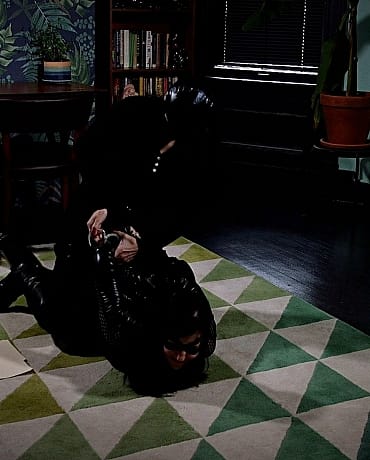 News reporter Tina has run across an unidentified woman during her search for the sex slavery ring. Even though Mistress Scarlet is in prison, the rest of her organization is still out there. She’s noticed this woman has shown up in security cameras near a couple of the nappers’ old hideouts so she’s followed her here and is staking her out. The burglar, Nyxon, is snooping around with a flashlight and comes across some documents. She is suddenly disturbed by a woman in a mask, one of the nappers! Nyxon throws the papers at the napper, trying to run, but the napper whips a bola at her legs and gets the cat burglar to the ground and handcuffs her. She gets her gagged and ties her to a chair with a hitachi strapped to her. The masked woman enters the room again and tells Nyxon that her ride will be there shortly, but in the meantime she could probably use some warm-up training. She turns the vibrator on and makes Nyxon cum. Having better things to do than wait around, she blindfolds Nyxon and leaves the room while Nyxon squirms against the vibrator. Tina is waiting outside the building and notices that the burglar is taking a long time inside and decides to go investigate. She finds Nyxon exactly how the napper left her. She turns off the vibrator, removes her blindfold and gag and asks Nyxon why she broke into the building. Nyxon is hesitant at first but recognizes Tina as the news reporter and comes up with a lie, seeing an opportunity arise for her escape. Tina finally gets her untied and has decided they’re going to go to the police but Nyxon grabs the telephone sitting on the table and hits the news reporter over the head. Tina is now tied up to the chair with a vibrator and Nyxon has switched their clothing. Nyxon apologizes and tells her that she needs a fall girl and that everything she told her was bullshit. Nyxon taunts, blindfolds her then leaves. Tina struggles hard in the chair realizing she’s been left for the slavers to find but becomes aroused by the vibrator and ropes. Suddenly the napper is there groping her and telling her it’s good practice for her new life as a slave. They’re interrupted when her “ride” shows up. A masked man comes into the room and they are talking and untying Tina. She recognizes his voice as the same guy that grabbed her and Rapture and only has one chance to make an escape. The woman pulls Tina to stand up, as the man starts to tie her knees but before he can get the ropes around her legs, Tina knees him in the face and karate chops the woman, sending them both to the ground. Tina pulls her blindfold off and the man recognizes that it’s Justice! The female napper whips her bola at Tina and she stumbles to the ground near where her camera bag is. She reaches inside and throws a smoke bomb to the floor, making it possible to escape. Tina gets to safety and realizes it’s time for her to serve Justice to the city...
