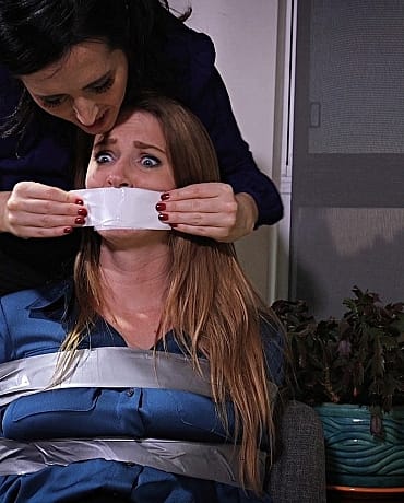 Dixie demonstrates Gag Talk Industry's business model using her co-worker Ashley as an example. They like to punish their employees by tying them up and gagging them.