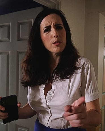 A real estate agent who is desperate to pee can't hold it anymore when her client won't stop asking questions and ends up peeing in a glass from the kitchen sink right in front of him, much to her humiliation.