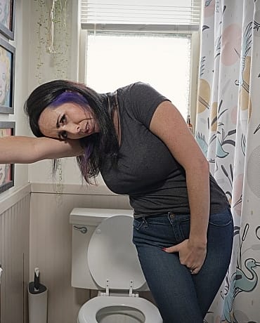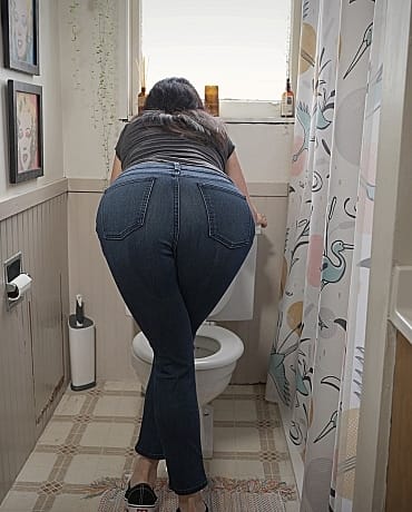 Tina has been drinking a bunch of soda but you won't let her pee. Even after you get home and she gets to the bathroom you still won't let her go, making her dance around and grab her crotch in desperation right in front of the toilet. Finally you make her pull down her jeans and show you her pussy and ass before having her sit bare assed on the toilet but still not allowed to pee. The desperation is intense and finally she can't take it anymore.